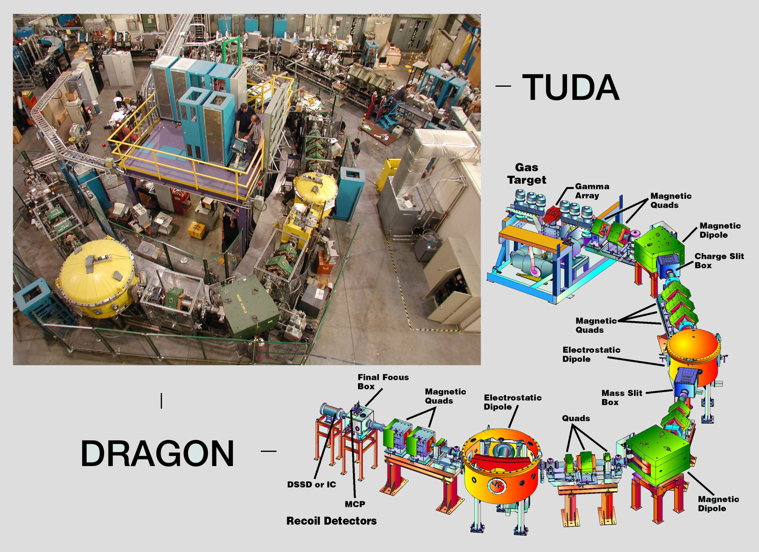 TUDA is a 2 metre long tube-shaped facility that can be mounted at the end of a beam line in either ISAC-I or –II. In overview, exotic-ion beams from ISAC-I or –II are fired at a target and the charged nuclear reaction products, or recoils, are detected downstream by an array of sophisticated silicon strip detectors.